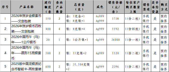 根据中国人民银行贵金属纪念币发行安排,2025年陆续发行2025版中国龙银质纪念币、2026中国丙午(马)年贵金属纪念币和2026年贺岁金银纪念币。我行根据安排将参与以上三个项目销售工作。现将有关事项公告如下: