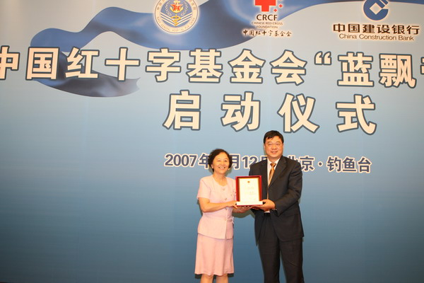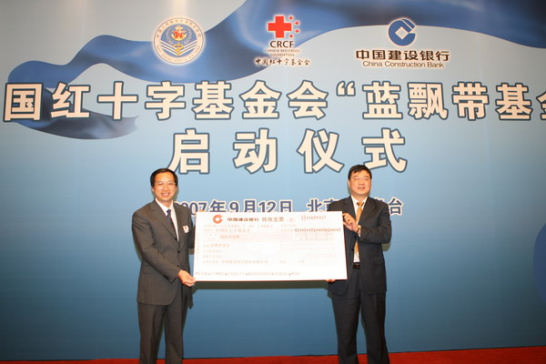 中国建设银行向中国红十字基金会“蓝飘带基金”捐赠100万元启动资金。