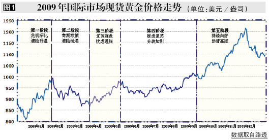 2009年国际市场现货黄金价格在危机与复苏中均表现良好。年初,国际现货金价以879.3美元/盎司开盘,下踩年内低点801.65美元/盎司后,即发动冲击千元的攻势;二月中旬金价年内首次攻破千元至1005.4美元/盎司,之后大幅调整至870美元/盎司附近;4月中旬至8月末,国际金价在900-1000美元/盎司区间内宽幅震荡;9月中旬,金价再次攻破千元关口,并在此轮涨势中创下1226.1美元/盎司的历史新高;其后由于美元反弹,金价涨势有所收敛,最终报收于1095.7美元/盎司。年内金价走势依据市场背景可大致分为五个阶段:(见图1)