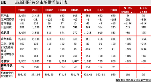 根据世界黄金协会的统计数据显示,2009年前三季度全球黄金总供给达到了2958吨,较2008年同期增加421吨;2009年第二、三季度较一季度总需求明显萎缩,主要原因是投资需求有所下滑,但消费需求、工业牙科需求逐渐回升。总体来看,2009年黄金市场总供给较上年稳步增加,而总需求有所减弱,但投机性需求即推断净投资需求持续上升,表明金融市场环境较2008年显著改善,投资者交易意愿增强。(见表1)