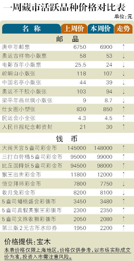 邮市方面:连续半个月调整,令短线客如惊弓之鸟,导致近期热点品种抛压沉重,如不少小版张已跌回前期起涨点。但JT票却拒绝下跌,强势品种又显山露水,像“庚申猴”邮票创出6900元新高,“红楼梦”小型张也扬升至1250元。币市方面:金银币表现温和,彩金币依然碎步前行,但幅度有限。而第三版人民币则全线走强,如1角面值“背绿”有水印券攀升到23000元,“红一角”券也突破4000元关口,升至4100元,不过涨幅最大的当属一角平版红字三罗码券,价格由上周初的25元飙升至40元,一周升幅达6成。