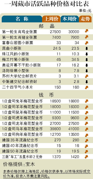 10月下旬,邮币市场强势不减,尽管国际金银价回调,但金银币却拒绝下跌,而邮市上的JT小型张再度上扬。邮市方面:JT票买盘渐增,从小爱科学簪花仕女图西厢记梅花小型张分别走高到15200元、950元、770元和203元。而小版张中的杨柳青春节城市建筑则攀升至41元、145元和75元。币市方面:受中国加息影响,国际金价一周来现下跌走势,彩金银币也高位盘旋。但梅花型和扇形金银币继续上扬,其中扇形虎年银币快速走高到1000元附近,梅花型狗年牛年虎年银币上扬至950元、2280元和900元。