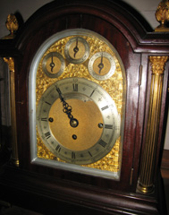 随后苏建华得意地说起条案中央座落的伦敦钟。这座伦敦钟是1785年在伦敦制造的,已经有几百年了,走起来很准的。你看这钟面装饰是黄金打造的,行家叫锤金,你听听它走起来是没有声音的!你看钟面上面刻有三位工匠的名字,一个是做机芯的,一个是做表盘的,一个是做外壳的。看伦敦钟一定要看签名。做一个伦敦钟一般要1-2年,后来有一些犹太人做冒牌的伦敦钟,但他们不敢签名,钟卖的也很便宜,这种做法很劣等。苏建华一口气说下来。