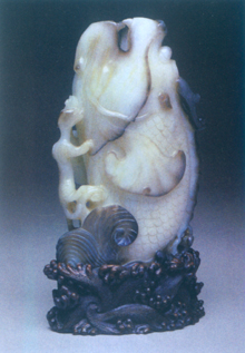 本件作品主要外形为一鱼,鱼身纵向,鱼尾上扬,下端则雕饰波涛,并配以水纹木座与之呼应,可见此鱼正自水中奋力跃出。再看鱼首,双目努出,有长须、突鼻、生双鱼,分明已成龙形——可见,此物是在寓意鱼跃龙门的吉兆。