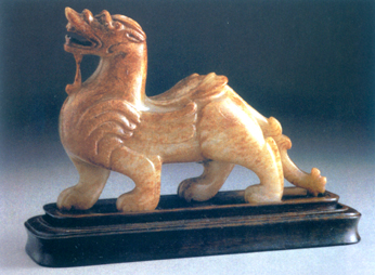 辟邪,是想象中的神话动物,传说能避除邪恶。这件辟邪以青白玉琢成,昂首张口,似在低吼,跨步游走,双翼做蓄势待发状,颔下长须垂胸,长尾曳地,器宇非凡。这是目前所知的汉代玉辟邪中体积较大的一件,曾为帝王重要的收藏,胸前刻有御制诗。