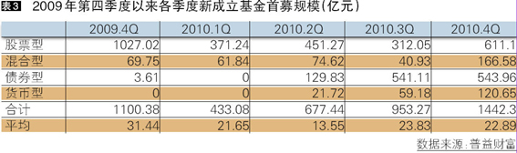 本季度成立数量大幅上涨的同时,募集规模也明显增加,为1442.30亿元,环比增长51.30%;新基金的密集发行一定程度上可以弥补存量基金资产的减少。虽然在数量和总募集规模上创出新高,但是基金的平均规模为22.89亿元,环比减少4.37%,而上一季度环比为增加75.90%。从具体类型看,36只股票基金共募集人民币611.10亿元,平均每只募集16.98亿元,较上月增加3.41亿元左右;4只混合基金募集166.58亿元,平均每只募集41.64亿元,较上月的平均规模增加0.71亿元; 21只债券基金共募集543.96亿元,平均募集25.90亿元,相比上月减少21.64亿元,债券型基金单只募集规模明显下降也与四季度以来债券市场受经济回升基础加强,央行加息影响而看空情绪浓厚影响而下跌有关;2只货币基金共募120.65亿元,平均募集60.33亿元。(表3)