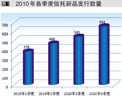 2010年第4季度(以下简称“本季度”),集合信托产品的发行再创新高:共有55家信托公司向市场输送集合信托产品,较上月增加7家;向市场输送信托产品661款,较上季度的545款增加116款,增幅达21.29%。本季度不仅向市场输送产品的信托公司增加,而且不少信托公司的发行频率也明显提高,其中边贸信托发行75款,较上季度发行数量最多的中融信托(48款)增加了27款。紧跟其后发行量较多的还有中融信托、联华信托、中信信托与平安信托,分别发行72款、40款、34款、33款。(图1)