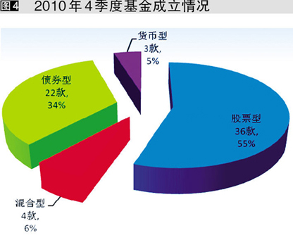 从成立基金的类型上看,各类基金均表现不同程度的增长。本季度共有36只股票基金(包括指数基金、QDII基金;分级基金分开计算)、4只混合基金、22只债券基金与3只货币市场基金成立。本季度债券基金继续保持了增长态势,较上一季度增加了6只。(图4)