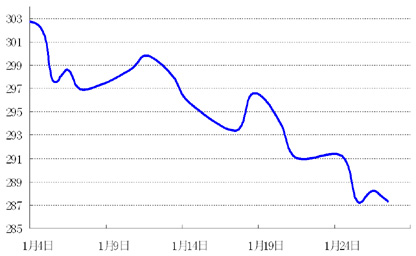 上周美国四季度GDP为3.2%,略逊于市场预期3.5%,但仍显示该国经济正步入稳步复苏阶段,尤其是经济增长动力转向私人部门,库存对经济贡献度下降,显示经济增长质量好转。但美元走势与经济数据关系不大,突尼斯和埃及动乱升级,导致避险买盘大举建仓,美元强势反弹。美元指数本周交投区间在77.60~78.50,收于78.15。欧元上周涨势趋缓,周五突如其来的动乱升级,导致欧元大跌,吞噬本周前期所有涨幅。欧元本周交投区间1.3537~1.3758,收于1.3610。日元受评级机构调降日本主权债务评级影响,周四大跌,但仅仅维持一天后因避险买盘买入影响大涨。日元本周交投区间在81.95~83.21,收于82.11