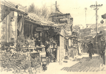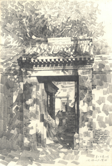 烟袋斜街是个很有名的胡同,它始终在修整,没修整的时候,整列房子的结构非常漂亮,有点南方的感觉。茅草杂生,层次分明。但这张就属于下笔之前没想好,想好的时候已经晚了,是一幅不成功的作品。当时就是看这些花草觉得特喜欢,照片上没有发现弱点,但画作和照片毕竟有区别,照片照出来漂亮,但搬上画作未必漂亮,因为画里就是黑白灰的组合,不可能和照片一样。一张很好的照片画出来未必漂亮。但是一张很差的照片完全可以画出来非常漂亮。我很喜欢画光,从大的方面来说没有光什么都看不见,我很喜欢逆光的东西,但光非常难画。一次画牛街四条,有一张逆光的,画了五遍还没画好。阴影的关系非常难处理,油画是可以覆盖的,轻轻的画一下,然后慢慢铺开,但是铅笔画不好控制。人家都说我的画漂亮,其实就是光线漂亮。胡同本身是有些灰暗色调的建筑,只有光影一照,马上变得斑斓多彩。打个比方,就是一面墙不觉的有什么,如果旁边有棵树,树的影子打到墙上,那就很漂亮了。