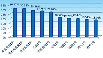 受累于A股市场的大幅波动,本季度股票型券商集合理财产品收益普遍受损,收益为负的产品近50%。其中,股票型券商集合理财产品的平均收益率为0.08%。上季度表现最好的东北证券2号表现急剧向下,本季度亏损0.61%。受到股市风格轮换的影响,导致各种风格的股票型券商集合理财产品表现出现分化。其中,东海证券旗下的两只产品——东海东风5号和东海东风3号分别以10.68%6.37%的收益成为表现最好的产品;而表现最差的一只产品亏损6.63%。(图6