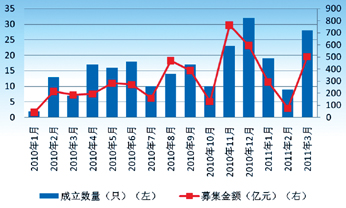 本季度共成立新基金56只,较上季度减少9只,环比降幅达到13.85%。一般来说,由于春节的影响,一季度往往为基金成立的低谷。但是,除了2月份稍有回落后,3月份新产品的成立数量迅速得到提升,当月成立产品达到28只。自上证综合指数在2011125触及年内的2659点的低点后,春节后开始快速反弹。在股市短暂回暖的激励下,基金成立数量也随之增长。(图4