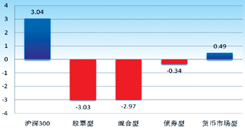 总体来看,本季度基金收益出现大面积的亏损,各类基金的平均表现都差于大盘表现。其中,货币市场型基金上涨0.49%,成为表现最好的产品类型。股票型基金下跌3.03%,为表现最差的产品,其中南方隆元表现最优,增长率为10.13%;混合型基金下跌2.97%,表现最好的是上投摩根中国优势,增长率为6.45%;债券型基金平均下跌0.34%,表现最好的为招商安本增利,增长率为2.83%。(图5)