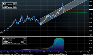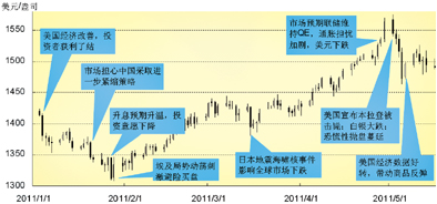 本阶段影响黄金价格的主要因素是经济基本面、政府经济政策和突发事件(图 1)。1月份,经济基本面总体向好,美国经济改善,欧债危机趋于复杂化,加之市场担忧通胀严重的国家采取紧缩货币政策,黄金价格有所下跌;2月份开始,中东、非洲、欧洲多个国家政治持续动荡,成为刺激金价上涨的因素之一;3月份,日本接连遭遇地震、海啸灾难和核泄漏事件,全球市场均受到影响,黄金呈现整理形态;4月份开始,美国持续施行量化宽松的货币政策再次成为影响市场的主要因素;进入5月份,美国宣布本拉登被击毙,商品市场发生连锁反应轮番大跌,黄金跟随下跌,目前有所反弹。
