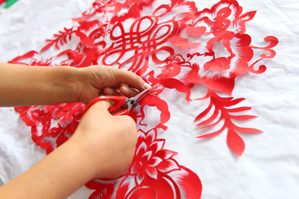曹永琴仍旧一言不发,还在剪着莲花边,她的安静流淌在每一个细小的齿尖上,喜悦和满足都却留在了那些花纹和红纸中。这样的沉默并没有让场合显得尴尬,她沉浸在自己的小世界中,连带着我们,也被感染。她不多的需要开口说话的场合,是在课堂上。在当地政府推广的“民间艺术进课堂”项目中,曹永琴被指定为小学4-5年级的学生教授剪纸。跟她学的大概有50来人,小孩子喜欢卡通形象,她便加到课程里来。先教些简单的单一形状,然后再将单一形状合成为蝴蝶、猫狗等简单的动物造型,孩子们便觉得没那么枯燥了。至于是否能从中发现有天赋也有心学剪纸的继承者,曹永琴觉得这是可遇不可求的。女儿活泼好动,却喜弹琴,但对于剪纸的传承,她从不强加给女儿。总觉得若女儿有此心,不会等她来催促,若无此意,即便强迫也不会剪好。