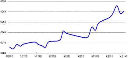 上周,在中间价连续四天快速下行的带动下,人民币升值预期加剧。上周五,人民币兑美元中间价报6.2395元,较前周大幅下降111个基点;美元兑人民币即期价盘终收于6.1776元,较前周下跌0.24%。
