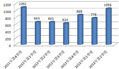 图1 2011年第4季~2013年第2季集合信托新品发行量(单位:款)
