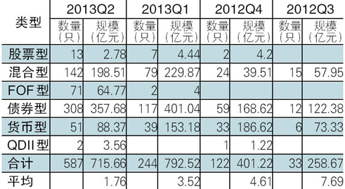 2013年第2季度,券商集合理财产品发行款数较上季度呈现大幅增长。本季度新成立产品共计587款,环比增幅为1.41倍;首发募集规模合计715.66亿元,环比降幅为9.70%;平均募集规模1.76亿元,与上季度相比,季度平均规模进一步大幅下滑。其中,募集规模最大的是宏源证券旗下的混合型产品——宏源证券鑫丰1号限额特定集合资产管理计划,其募集规模为20亿元;募集规模最小的是海通证券资产旗下的股票型产品——海通海富1号限额特定集合资产管理计划,其募集规模仅54万元。
