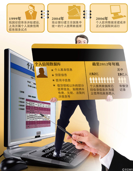 我国征信体系建设始于1999年。当年,上海开展个人消费信用信息服务试点;2004年,商业银行建立全国集中统一的个人信用数据库;2006年该数据库建成并正式全国联网运行。截至2012年年底,个人信用数据库已经收录了近8.2亿自然人的信息并为他们建立了信用档案,其中2.9亿人有信贷记录,全年累计查询分别约2.7亿次。图/CFP