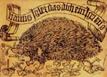 藏书票作为“舶来品”,已有五百多年历史了。据说,世界第一枚藏书票由德国人克那本斯堡于一七四O年创制,名叫《刺猬》。画面是一只硕大的刺猬,嘴里衔着一枝野花,脚下踩着缤纷的花草,上端有一飘带,写有德文“慎防刺猬一吻”,意在提醒人们不得盗书和毁书。