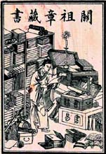 中国的藏书票创作起步较晚,从现在有记录的发掘历史来看,在一九一三年出版的《图解法文百科辞典》中,扉页上贴有一枚藏书票,名叫《关祖章藏书》。画面是满壁皆书的书房内,头戴布帽的一位书生,似乎在潜心阅读,似乎在查找资料。这关祖章也许是中国使用藏书票的第一人。