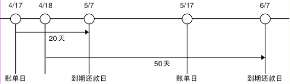 (三)免息还款期:免息时间从银行记账日起至还款日止,最短20天,最长50天。若账单日为17日,则17日消费计入当期账单,18日消费计入下一期账单,在全额还款情况下,17日消费享受20天免息期,18日的消费享受最长50天免息期。