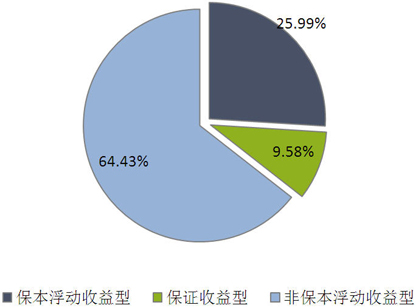 从收益类型来看,保证收益型产品发行3890款,同比增加13款,市场占比下降2.52个百分点至9.58%;保本浮动收益型产品发行10548款,同比增加4362款,市场占比上升6.67个百分点至25.99%;非保本浮动收益型产品发行26151款,同比增加4189款,市场占比下降4.15个百分点至64.43%。(图2)