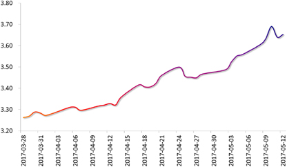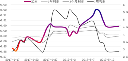 外汇市场:“一带一路”峰会召开前夕,人民币窄幅波动,当周累计小幅贬值0.04%。由于上周美国CPI数据不及预期,年内继续加息两次概率下降,预计人民币仍将维持区间震荡态势。
