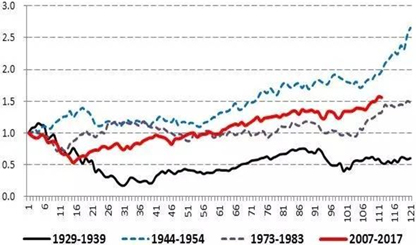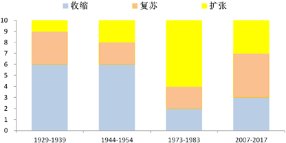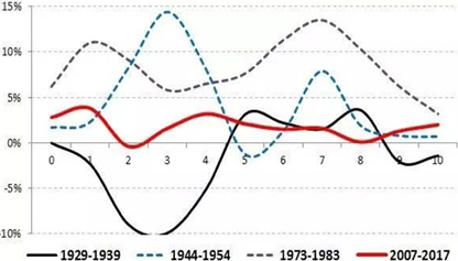 如下两图(均以危机爆发前一年的GDP为基数1,收缩为<1,1<复苏<1.1,扩张为>1.1),与前三次大危机相比,本次危机的复苏期是最长——4年(2011-2014),而且从经济增速曲线的斜率来看,本次危机虽然较早的脱离衰退,但复苏的力量是偏弱的。其背后的原因,则是经济内生新动力至今尚未显化和成形。(图1、2)