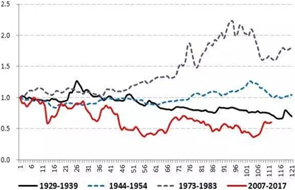 与前三次危机不同之处,私人消费已成为美国经济最主要的因素,危机后的复苏拉动,也主要来自私人消费,由此金融市场繁荣带来的财富效应,和资金的配置效率,对于美国经济而言至关重要。如下图(均以危机爆发前为基数1),四次危机中,本次危机复苏进程中,长期利率是最低的,股票市场的上涨程度和速度,也仅次于上世纪80年代全球化(大缓和)期间表现。