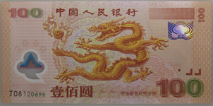 其次是“迎接新世纪念钞”,主图为民族图腾“龙”的形象, 全钞主色调为黄色。发行量1000万枚,与“建国50周年纪念钞”一样,在其发行的头几年时间里,由于收藏投资者关注不够,导致其市场价格在110元至130元之间徘徊数年。从2010年开始这条中华巨龙才真正开始腾空飞舞,2011年后,其市场价格曾经创出3500元的历史新高价位。随后其市场价格一路下跌调整,最低时,市场价格下跌至1500元处,目前其最新的市场价格为1800元。与其历史高位价格相比较跌幅不小。“迎接新世纪念钞”的优势较多:发行量适中并且消耗时间也比较长;中国大陆发行的也是迄今为止唯一的塑料钞和中国大陆发行的唯一的以龙为主体形象的纪念钞票。