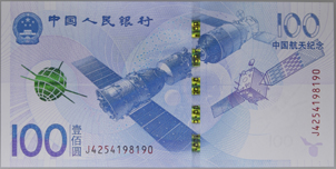第四是“中国航天纪念钞”,中国航天纪念钞主色调为蓝色,图案包括东方红一号卫星、神舟九号、天宫一号、嫦娥卫星等。这是新中国成立以来发行的第四张纪念钞,也是首张以航天为题材的纪念钞,因此备受关注。正面主景图案:为神舟九号飞船与天宫一号交会对接图案。左上方为国徽图案、“中国人民银行”行名,其下方为东方红一号卫星图案。票面左下方为面额数字“100”和汉字“壹佰圆”。主景图案右侧为嫦娥一号卫星图案,其上方为面额数字“100”和“中国航天纪念”字样。背面主景图案:由上至下依次为嫦娥一号卫星图案、2020年中国空间站“天宫”、喷气式客机、冯如2号双翼螺旋桨飞机、飞禽海东青图案。票面左上角为风筝局部图案,右上角为面额数字“100”。票面下方为行长章与年号“2015”,中国人民银行汉语拼音字母和蒙、藏、维、壮四种民族文字的“中国人民银行”字样与面额,面额数字“100”,汉语拼音字母“YUAN”。中国航天纪念钞面额、规格和发行数量:中国航天纪念钞面额为100元,票面长为155毫米,票面宽为77毫米,发行数量为3亿张。“中国航天纪念钞”最大的特点是发行量巨大为3亿枚,也正因为如此,使得其市场价格基本上在面值附近徘徊,短线肯定没有升值前景,长线则要看具体的市场消耗和人民银行有效回收的多寡。