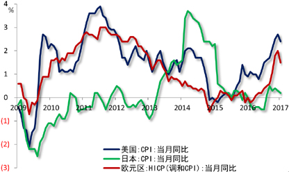 一季度GDP不变价环比折年率大幅降至0.7%,主因消费者支出显著下滑。3月个人消费支出(PCE)环比持平,实际个人消费支出环比增0.3%,均不及预期。房地产继续量价齐涨,3月成屋销售总数年化571万户,创2007年2月来新高,环比增速4.4%,也创2015年12月来最高,同时房价中位数连续61个月上扬。通胀因能源价格下降而涨势回落,3月CPI同比2.4%,较上月收窄0.3个百分点。美联储在5月议息会议上按兵不动,但或加紧制定缩表细节,年底可能启动缩表。
