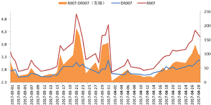 4月份资金面另外一个需要关注的因素是非银机构净融入余额大幅减少,截至4月底证券公司净回购余额较3月末净减少1420亿元,基金回购余额净减少约10800亿元。这或许意味着非银机构杠杆率水平有了较大幅度的降低。这点从R007与DR007之差的变化也可以观察到,4月两者之差波动明显降低。(图3)