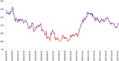 市场的风险偏好有所回升。今年来,日元的避险属性展露无疑。去年的几次黑天鹅事件仍历历在目,这让市场投资者在今年对此颇为忌惮。年初至今,全球政治经济局势也的确不太平。叙利亚冲突、朝鲜问题、欧洲大选,应接不暇。但正如我们在此前报告中提示,不管是日元还是欧元走势,都已经隐含了过多负面情绪。一旦局势发展比市场预期的乐观,将导致欧元的反弹和避险日元的下跌。目前,有市场恐慌指数之称的标普500 波动性指数(VIX)已回落至年内低位。此外,EPFR数据显示,新兴市场的资金流入强劲,市场风险偏好再起。如果朝鲜半岛局势不再进一步恶化,避险情绪对日元的推动效应将降低。
