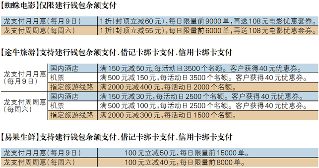 除上述活动外,建行还与中国领先休闲旅游在线服务商——同程网、中国大型在线票务服务公司——携程网、亚洲大型零售集团牛奶公司旗下连锁品牌——万宁mannings、高品质现代鲜果服务提供商——天天果园等一批旅游、商超、生鲜等行业龙头企业合作,为建行龙支付客户提供覆盖衣食住行娱乐购全方位消费场景的常态化优惠。没有建行卡的朋友也不用遗憾,建行龙支付除可绑定建行卡外,还可绑定工行、农行、中行、招商等多家银行的卡片,只需下载“中国建设银行”APP即可开通龙支付参与大部分商户活动。