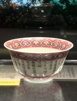 这件乾隆乙卯(1759)年制纯金印泥盒,引起我的兴趣,请工作人员拿来看看,金质的墨盒上精致的花纹图案突起于墨盒表面,给人一种极其华丽的感觉,拿在手里沉甸甸的,一侧有个小抽屉,拉开可以放置一枚印章。这件如此精致的印泥盒用纯金打造,该是宫内造办处专门制造,兴许还是乾隆书房御用之物,真真是精品算是开了眼界!