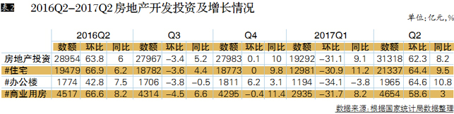 投资:开发投资增幅上了新台阶。房地产投资月度累计增幅2016年下半年是5.3-6.9%区间,今年上半年8.5-9.3%区间。平台上移,波幅降低。上半年住宅中的大面积房型投资增幅高于其他商品房。投资指向鲜明。投资增幅144平方米以上住房是13.6%,其中高档公寓和别墅是15.5%;而90平方米及以下住房则是-7.7%;办公楼和商业营业用房则分别是4.8%和5.0%。