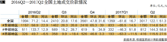 土地:购置费增幅高于工程和设备工器具购置。按照投资构成比较,增幅最大的是土地购置费,半年增幅为17.5%;安装工程增幅为8.5%,建筑工程增幅为6.6%,设备工器具购置增幅为3.9%。表明,相对于价格稳定的建筑工程和设备安装,土地要素价格依然高涨。上半年全国土地成交价款同比增长38.5%,这是超常规高增长;土地购置面积同比增长8.8%。土地价格是多年来推升房价上升的主要力量之一,其源于土地市场的垄断。但是,各省市同比增减幅高度差异化,高的增长200%,低的负增长-50%。