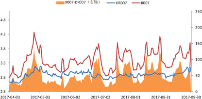 2017年三季度7天回购利率中枢为3.45%,较二季度上行10BP;存款类机构7天回购利率中枢2.88%,与二季度持平。