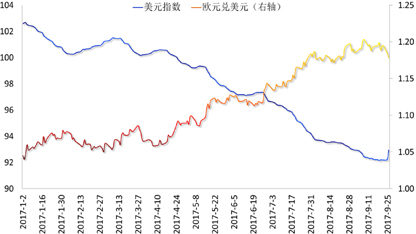首先,从外部来看,美元有望在四季度小幅反弹。特朗普在其医改法案折戟后,势必将在税改法案上有所作为,否则他的总统任期会非常难过。并且,在近期美国政坛频繁曝出重要官员辞职等负面事件的背景下,美元指数也未跌破91关口,因此,我们认为,美元接近利空出尽的状态。而美联储透露可能在12月加息,并且将于10月开始缩减到期资产的再投资,这将提振美元。最大变数将是欧洲央行的货币政策决议。在当前市场情绪一边倒地看多欧元的状况下,但凡欧洲央行在四季度的货币政策会议上超市场预期的鹰派,便有可能带来飙升的欧元,从而令美元指数承压。