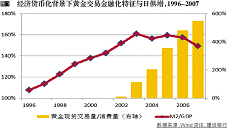 五年间,贸易顺差带来了外汇储备前所未有的爆发式增长,年均复合增速近48%,余额逾1.5万亿美元。随之而来的是我国经济货币化进程提速,金融深化进入新阶段,货币供应增速持续高于GDP增长率和通货膨胀率之和, M2占GDP的比重由90年代的1左右上升至1.5。在政策支持和经济提速双重刺激下,黄金市场交易的金融化特征日益明显。