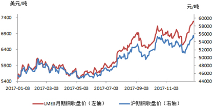 2017年伦铜市场开于5542.5美元/吨,年末收于7251.5美元/吨,最高价7312.5美元/吨,最低价5450.5美元/吨,上涨31.46%;美铜走势与之基本一致,开于2.507美元/磅,年末收于3.295美元/磅,最高价3.322美元/磅,最低价2.473美元/磅,上涨31.48%;沪铜走势类似,但弱于前两者,开于45630元/吨,收于55580元/吨,最高价55990元/吨,最低价44420元/吨,上涨22.34%。(图1)