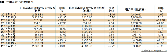 1.电力行业投资明显下滑。2017年前11月电力基本建设累计投资6991亿元,同比下降6.25%。从结构上看,电源基本建设累计投资2329亿元,同比下降13.39%,电网基本建设累计投资4662亿元,同比下降2.22%。根据“十三五”电力规划,电力行业投资年均基本是个位数增长,除了部分配电网投资增速较高外,大部分项目投资增速都将大幅下滑。2017年国家稳增长压力降低,叠加2016年较高基数,电力投资增速下滑就相对明显,预计电力投资增速将小幅回暖,实现个位数增长。(表1)