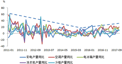 3.家电行业全面复苏。地产周期叠加出口复苏和消费升级,家电行业迎来久违繁荣。2017年前11月,彩电、空调、冰箱、洗衣机、冷柜产量分别累计增长0.8%、19.9%、12.6%、3.1%、9.4%。且随着消费升级,家用电器也呈现品类更多元化,如微波炉、洗碗机、烤箱、空气净化器、扫地机器人等高速增长。地产销售下行背景下,将对家电有所拖累,但出口复苏和消费升级为行业增长提供强劲支撑,预计2018年家电行业将延续复苏。(图3)