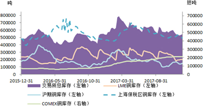 2017年三大交易所库存54.4万吨,基本与2016年持平,但是库存结构大幅变化。其中Comex铜库存从8.8万短吨附近大幅升至21万短吨,库存规模由末位跃居三大交易所首位,伦铜库存则出现较明显下滑,由年初32万吨附近降至20万吨,沪铜库存基本持平在15万吨附近。另外,保税区库存也基本持稳在45万吨附近。整体来看,全球精炼铜库存总量在2017年持稳,主要是内部结构调整。(图4)