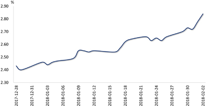 债券市场:上周,受市场流动性宽松、一级市场配置需求旺盛、1月制造业PMI低于预期的影响,债市延续暖势,但美债收益率持续大涨,加之严监管下市场交投谨慎,债券收益率下行空间有限。截至上周五,10年期国债收益率较前一周小幅下行3BP至3.91%。