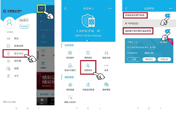 登录建行手机银行APP,点击首页左上角图标,点击“安全中心—信息管理—信息开关”,即可在“首页—账户”里看到完整的账户信息啦。