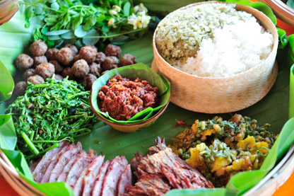 居住在滇西南的傣族、佤族的饮食结构由其居住的环境决定,因炎热所致,味喜酸、辣、苦(凉),三者皆可助开胃化食,消暑解毒杀菌。其食物种类极为繁多,除庭园种植和家庭饲养的物产以外,山野河流所产,似乎都可入食。当地人戏言:“凡是绿的都是菜,凡是动的都是肉。”更有一些奇异之物,如蚂蚁蛋、蝉蛹、花蜘蛛、青苔等皆为傣族喜爱的食品,使游客惊异不已。食物的烹制方法主要有烤、蒸、炸、煮、腌、剁、舂。而佐料的配制也极为讲究。
