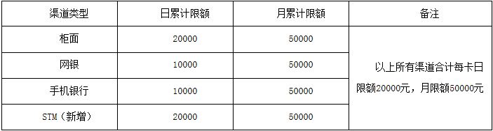 尊敬的客户: 我行龙卡信用卡现金转出业务将于11月18日新增STM(超级柜员机)受理渠道,现金转出业务该渠道相关收费标准及其他业务规则遵照现行《中国建设银行龙卡信用卡领用协议》及《收费标准》执行。现金转出业务各受理渠道限额如下: 特此公告,祝您用卡愉快! 中国建设银行海南省分行 2017年11月17日